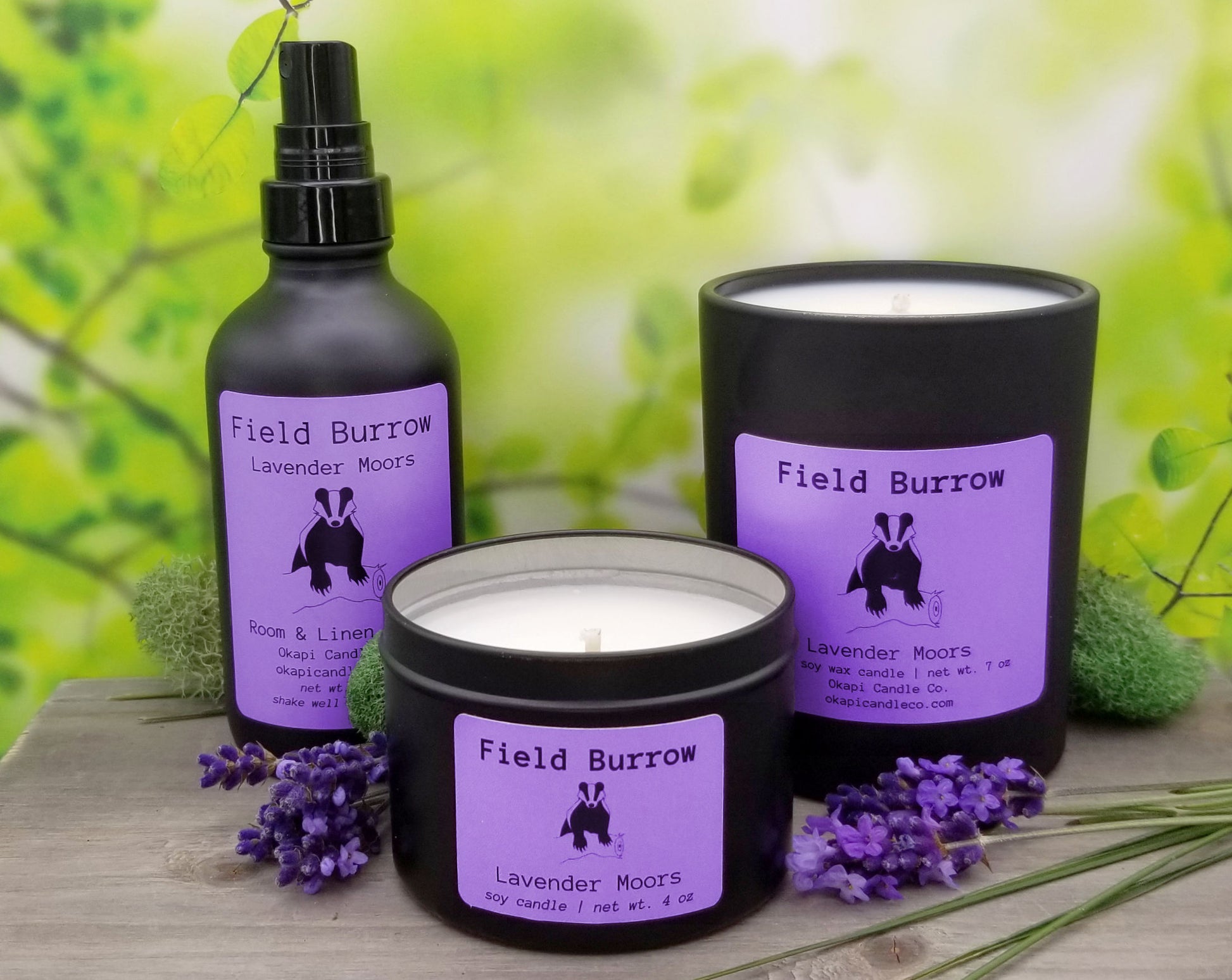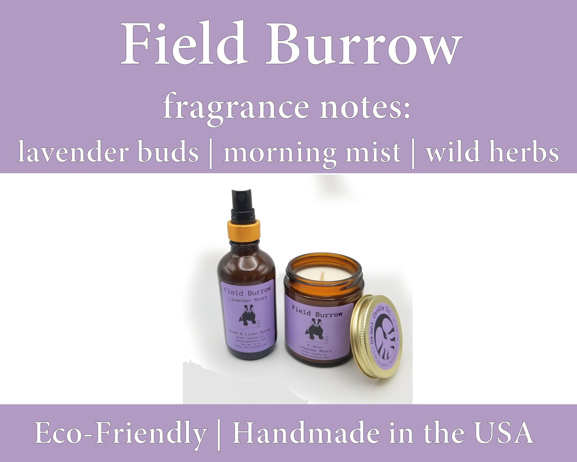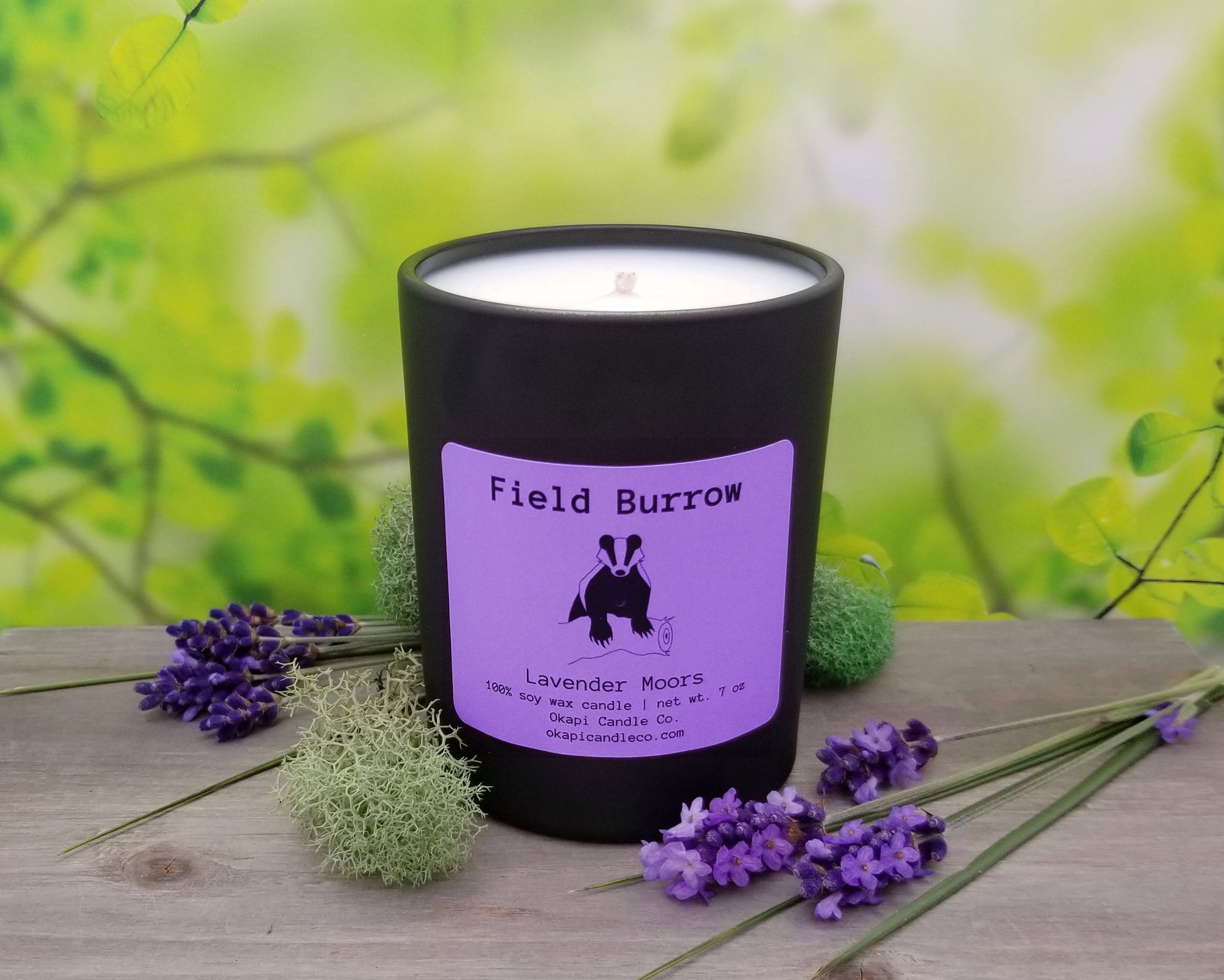 Our Field Burrow candle pays tribute to the European hills north of the Mediterranean, home to both native lavender and the European badger. The fragrance of blooming lavender mixes with earthy notes of green herbs to create a refreshing and natural-scented lavender. This candle is great for those with selective tastes, as it rejects the chemical-laden, artificial smell of most lavender products, and is reminiscent of lavender bushes and plant nurseries rather than cleaning products.